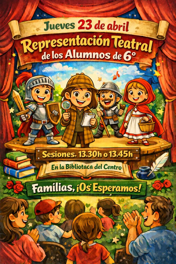 Entre estas actividades, nos complace informaros de que el jueves 23 de abril, los alumnos de 6º de Primaria representarán una obra de teatro para todas aquellas familias de la escuela que deseen asistir.